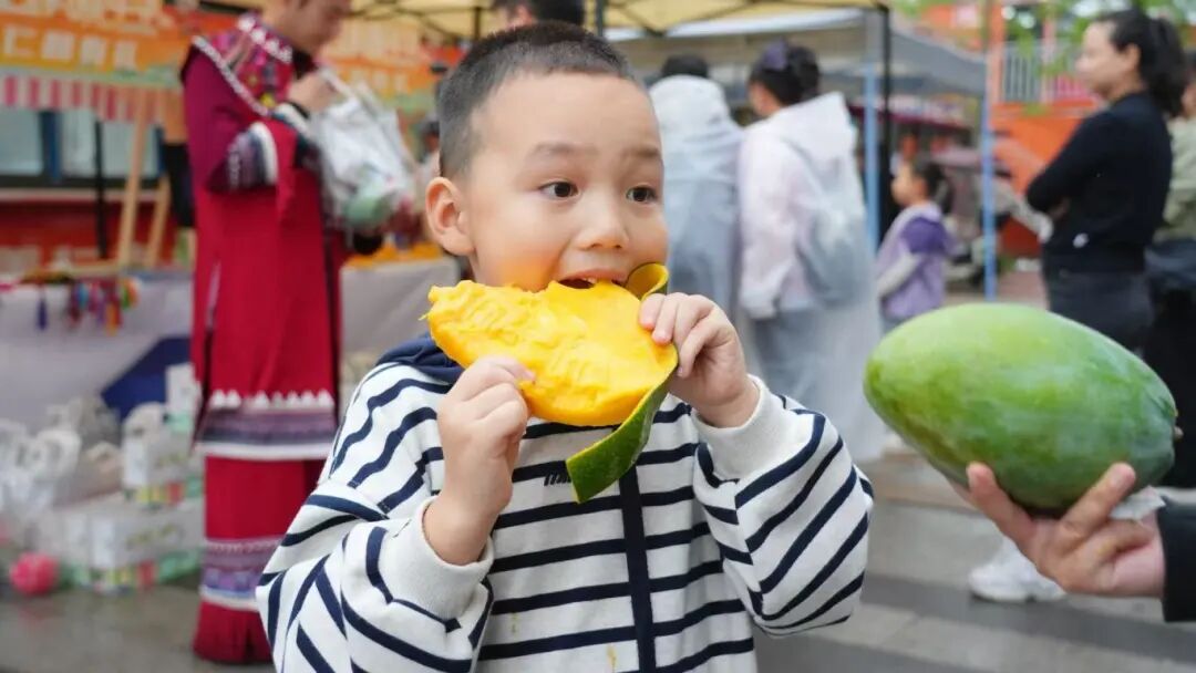 亮眼的走秀不止于此,演出人员手拿芒果、石榴,沿街巡游,派发出1000个芒果、1000个石榴,让“阳光味道”触达更多眉山市市民。