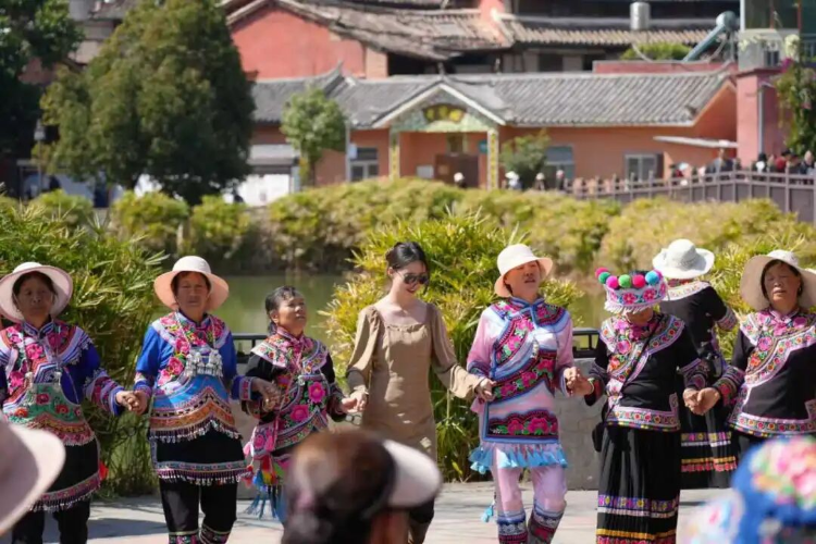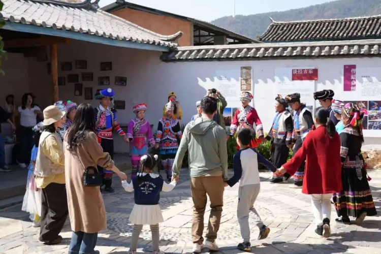 村委会门前下沉广场上,乐队奏响民谣乐曲,悠扬歌声回荡古村,不少游客闻声而来,与演员齐声同唱,现场气氛热烈温馨;身着节日盛装的村民热情洋溢,手拉手带领游客围圈打跳,舞步轻快、笑语连连,浓浓的民族风情感染着每一个人。