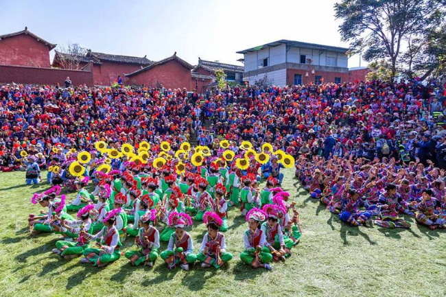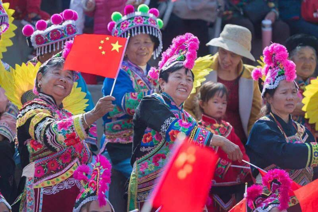 村寨内高龄的阿婆,看到这一幕幕动人的画面,听到这一声声悦耳的歌曲,也被深深地感染着,她奋力地挥舞着手中的国旗,然后跟着音乐声,不自觉地哼唱。