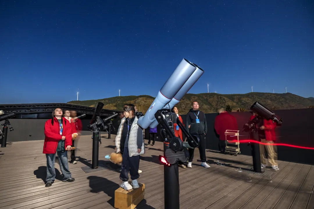 互动观测:走进观测区,使用基地的专业设备亲自探寻。基地共设有27个望远镜机位,包括科研级600毫米口径双曲面反射镜、230毫米口径卡塞格林式折反望远镜等。天文望远镜能直插相机卡导出星云照片,即使是摄影小白,也能拍到猎户座马头星云。