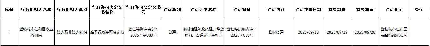 仁和区综合行政执法局行政许可信息公示(9.15-9.19)
