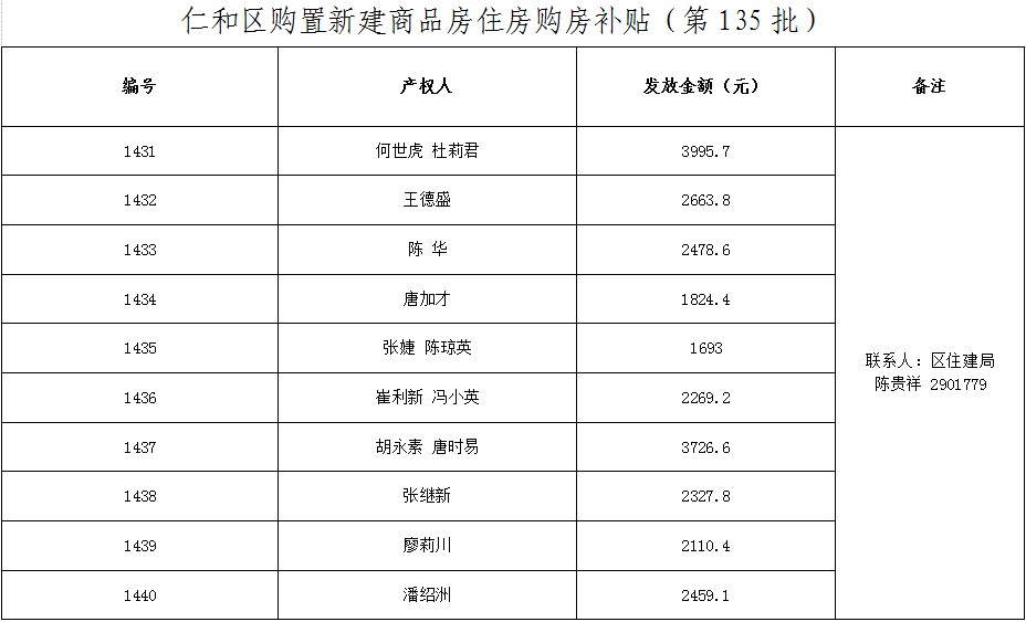 仁和区购置新建商品房住房购房补贴第135批
