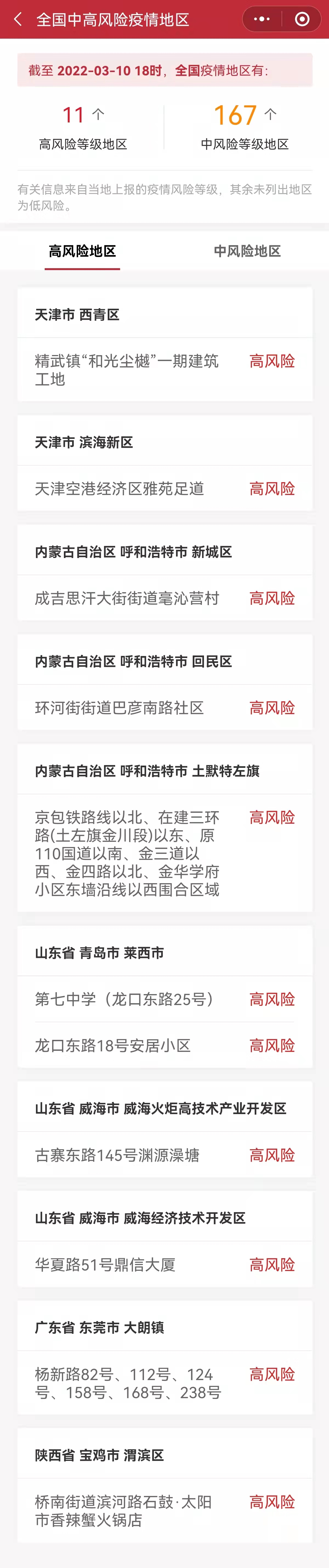 2022年3月10日18时全国中高风险疫情地区