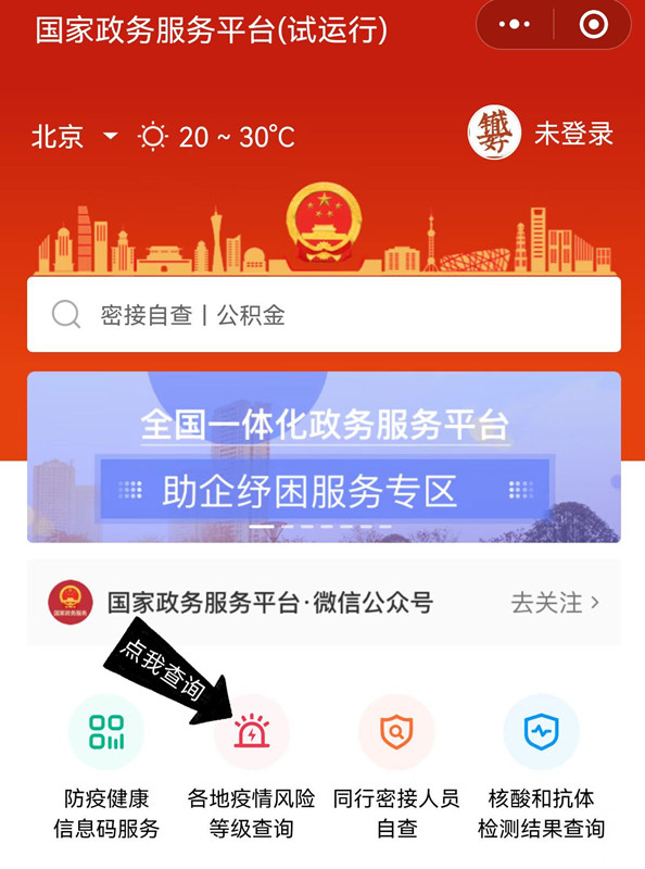 详情请在微信关注国家政务服务平台公众号,点击各地疫情风险等级查询查看,