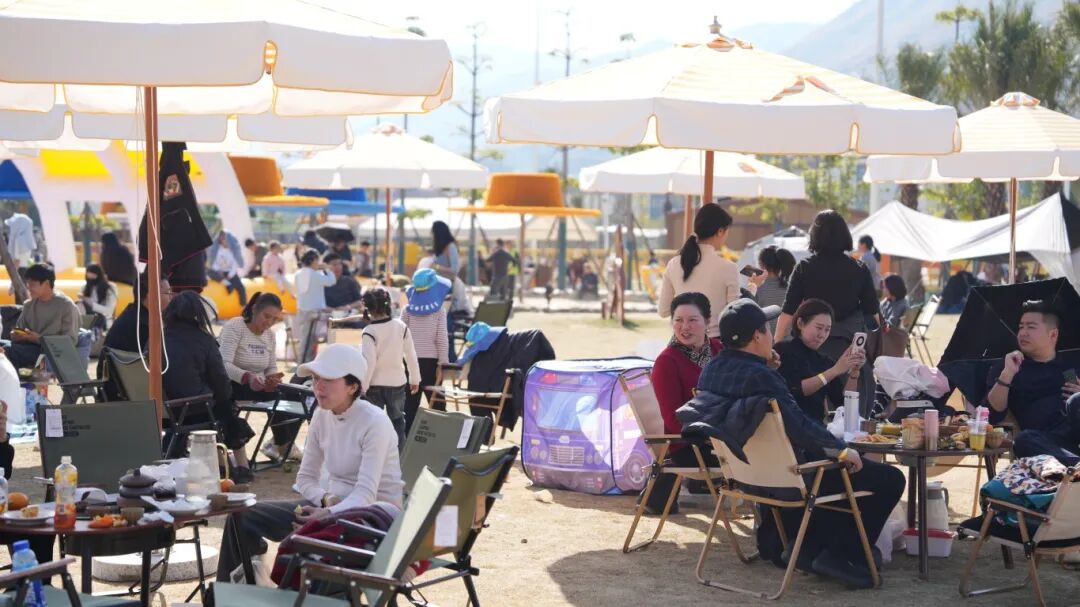 草帽农场的露天草坪上,帐篷错落点缀,家长们陪着孩子在无动力设施上追逐嬉闹,不少家庭铺开野餐垫,分享零食闲谈,尽享慢节奏的田园时光,新潮又惬意。