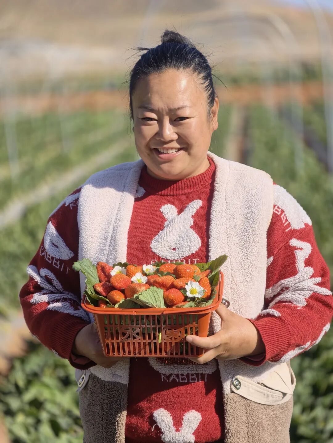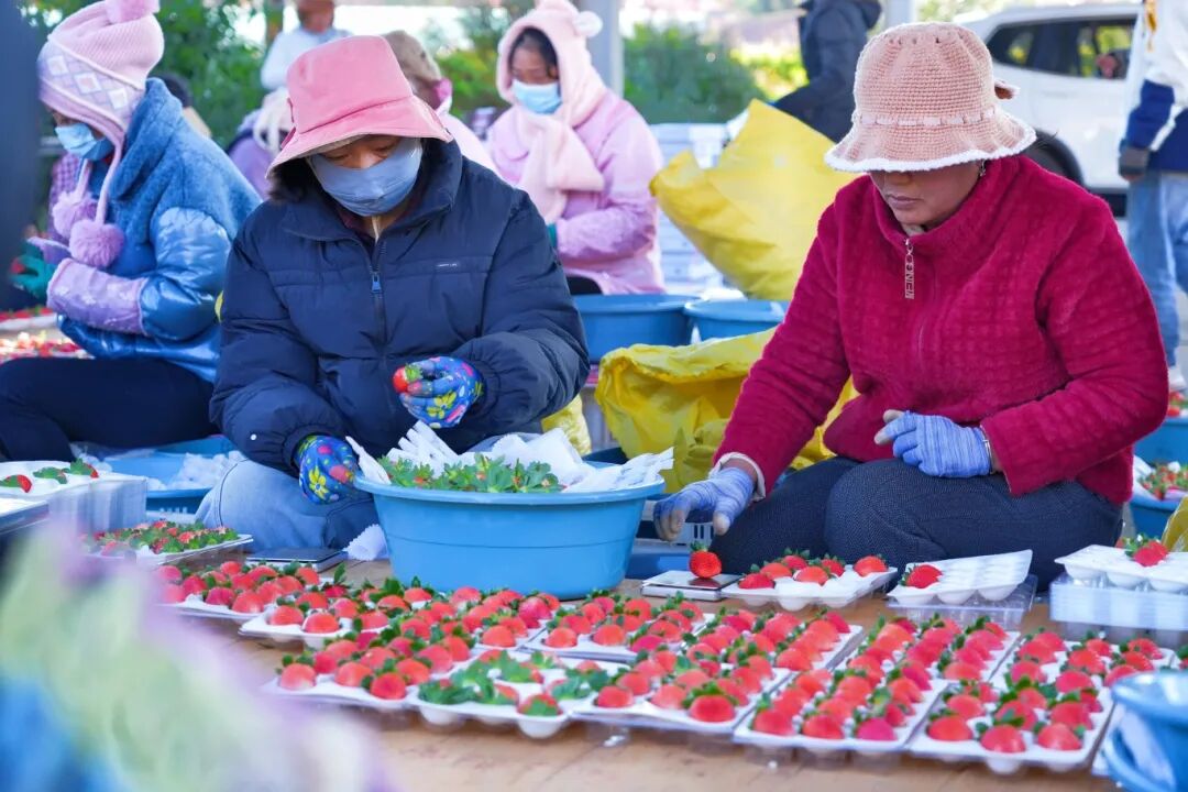 收购商王利强穿梭其中,手机信息提示音不断:“迤沙拉的草莓口感好,市场需求大,一开工就接到了很多订单,供不应求。”王利强表示,目前每天订单稳定在1000余斤,打包过程会根据草莓单果重量,按照分级标准精准发货,以最快速度、最优品质,将“新年第一甜”送往全国各地。