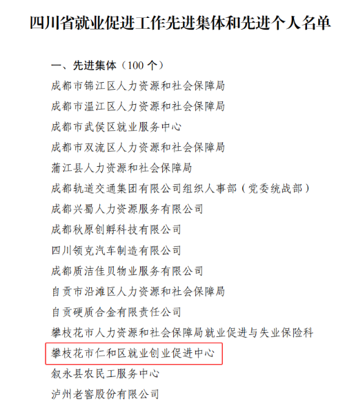 近日,四川省就业促进和劳动保护工作领导小组办公室、四川省人力资源和社会保障厅印发了《关于表彰四川省就业促进工作先进集体和先进个人的决定》,其中,攀枝花市仁和区就业创业促进中心上榜。