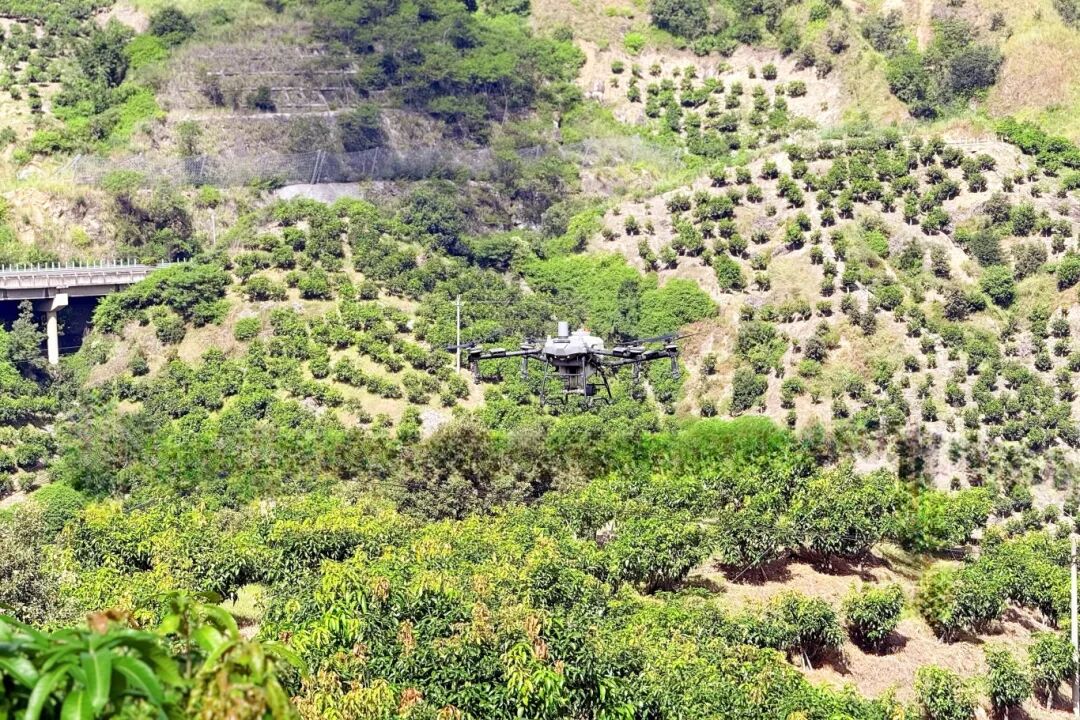 △无人机正在给芒果林喷洒农药