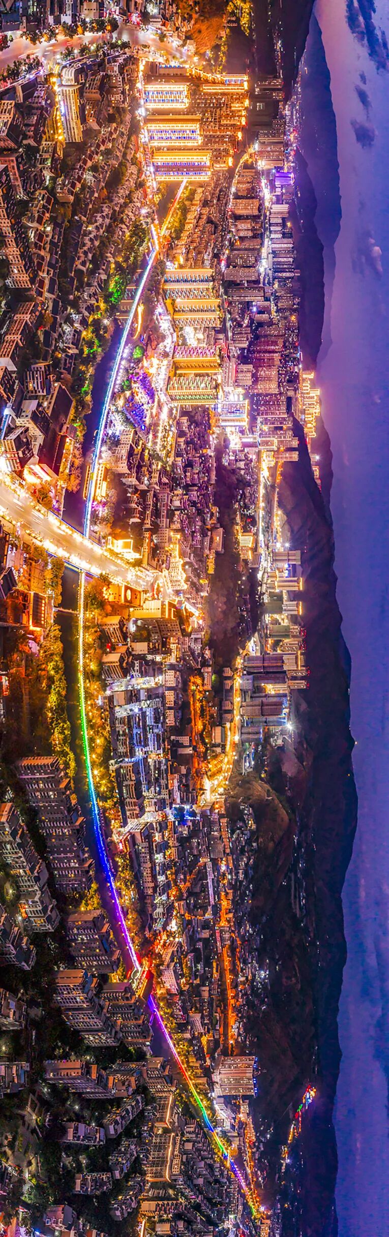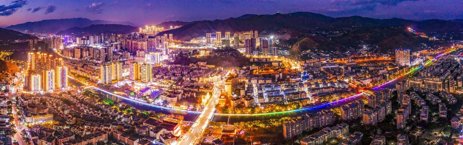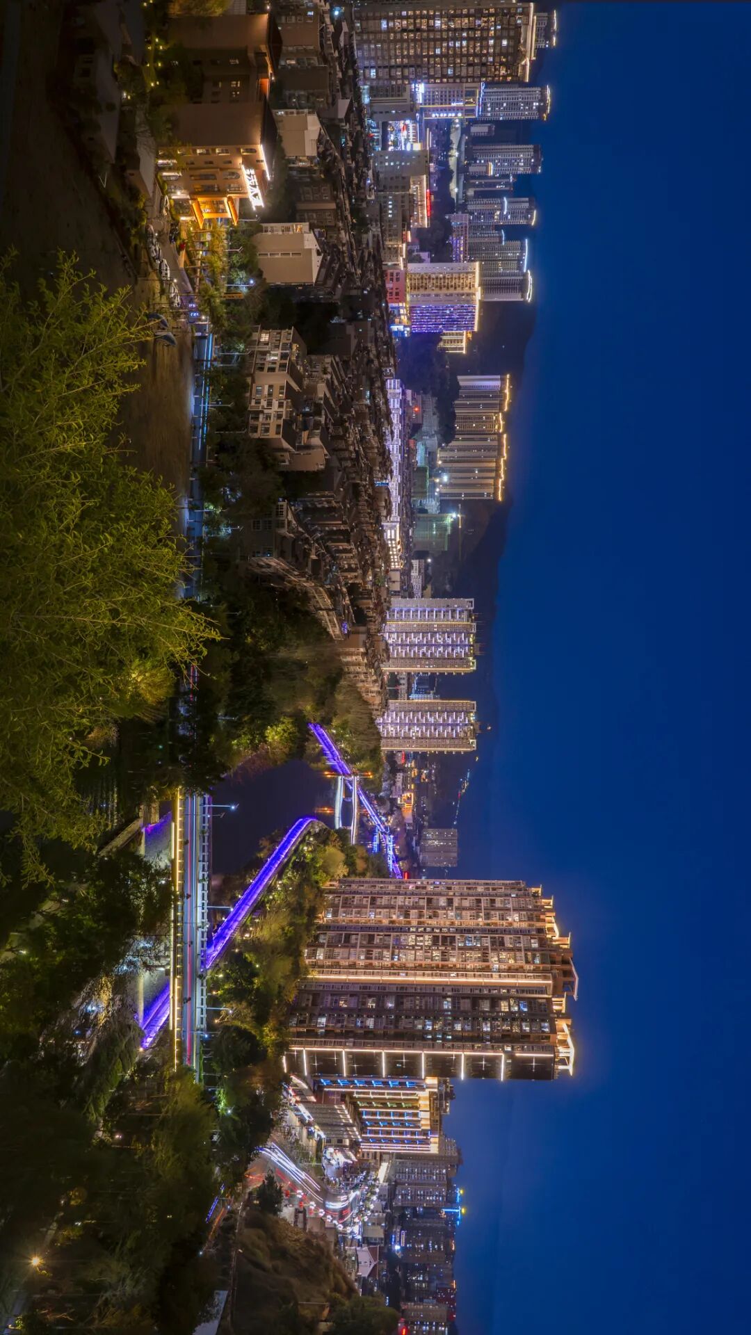 星河般的楼宇灯火裹着紫带似的大河河道,车流光痕与山影揉进夜的轮廓,把仁和城区的烟火烫成明暗交织的梦境。