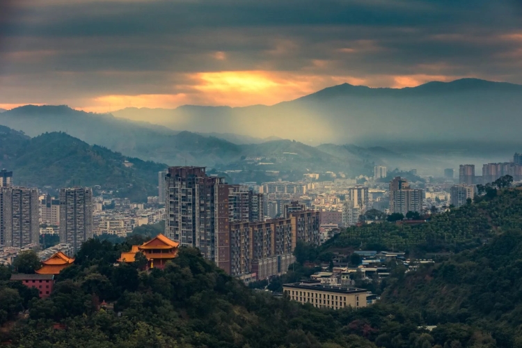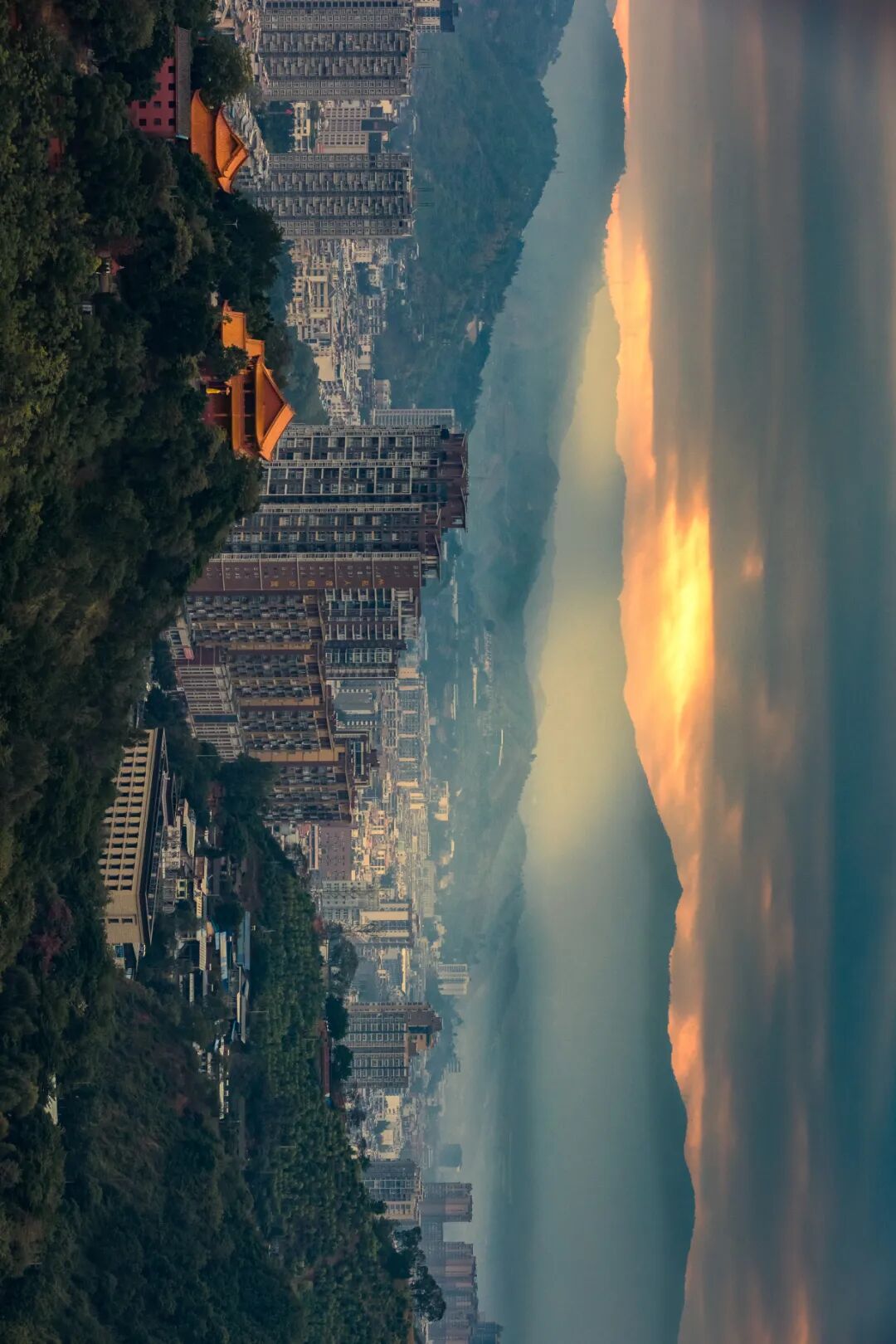 晕染着金紫晚霞的穹顶下,仁和城区的楼宇顺着山峦铺展,河道缠在街巷间,把烟火与山影揉进黄昏。