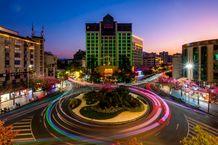 夜幕低垂,仁和的夜晚华灯初上,霓虹与车流交织成一片流动的光海。