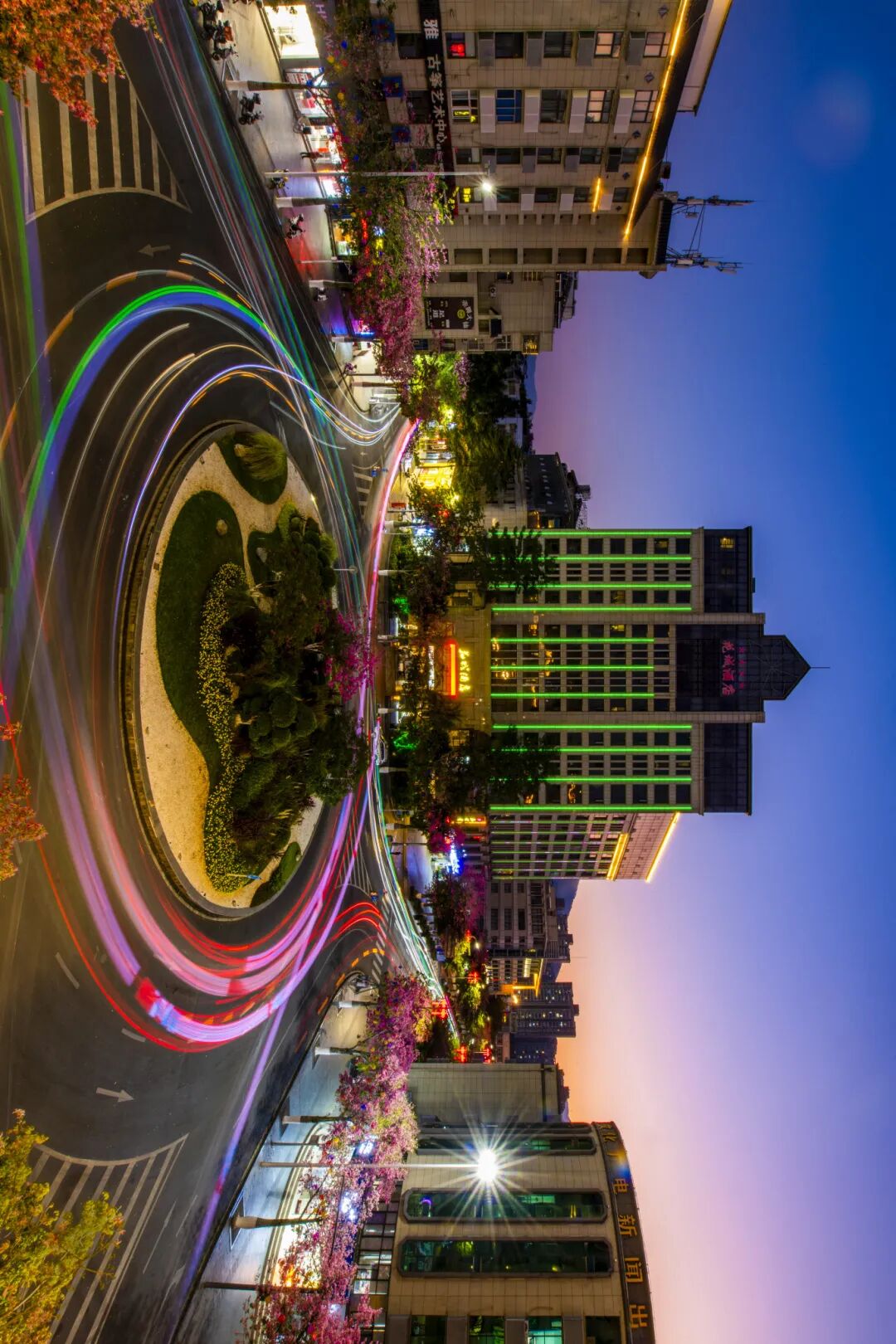 夜色中的环岛晕染着车轨织就的彩练,灯火与艳粉花树裹着仁和城区的夜,将车流画成灵动的光弧。