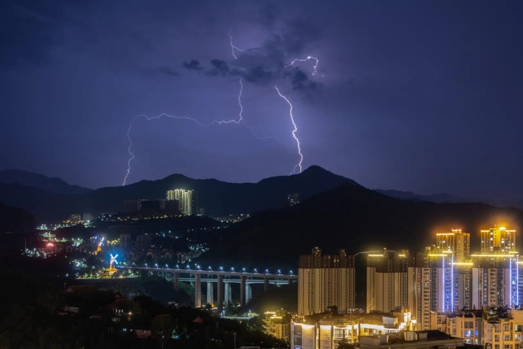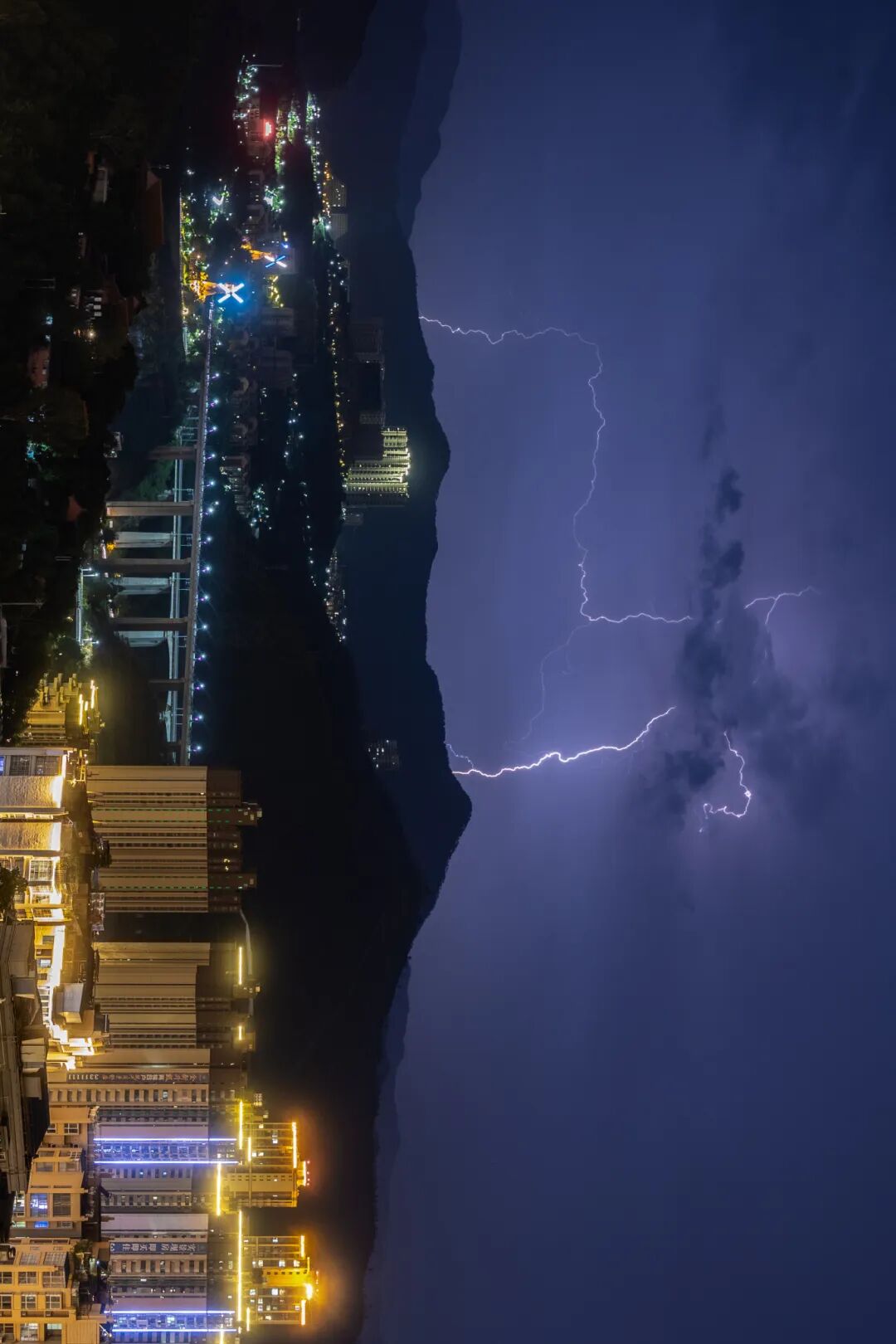 暗穹下,惊雷劈开的紫夜裹着仁和的城市灯火,桥与楼在山影间亮成星子,把天地磅礴与人间暖光拧成同框的震颤。
