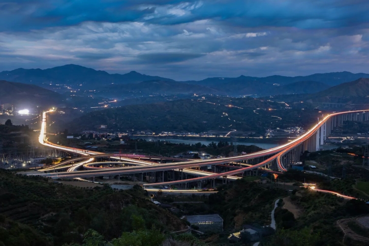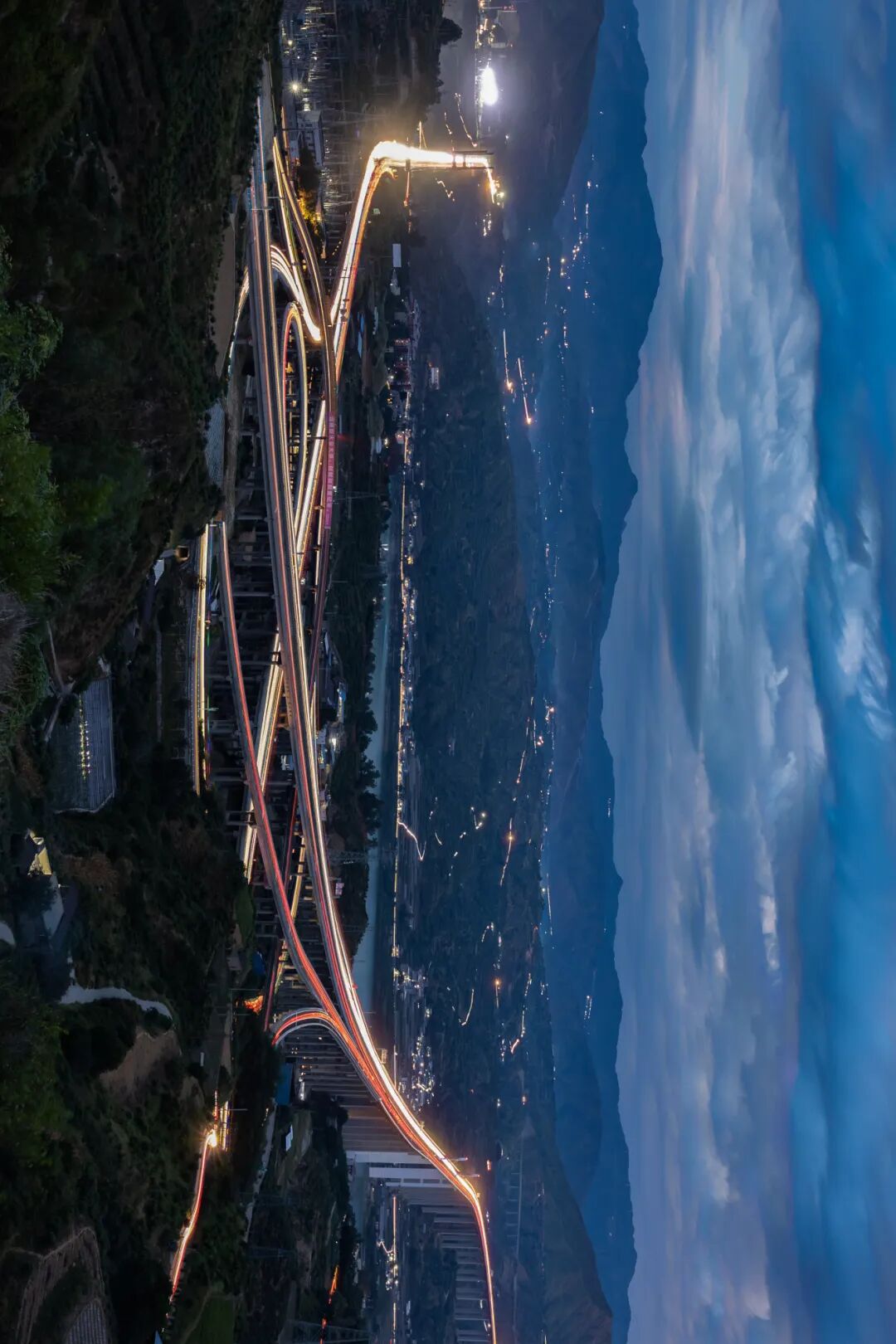 暮色里,群山下的立交桥被车流光带织成鎏金纽带,缠裹着江水与灯火,把山间的交通脉络晕成夜的绮梦。