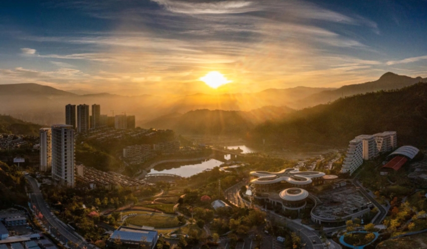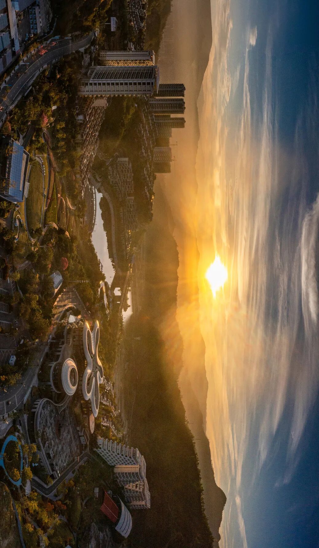 暮色漫过山峦,鎏金霞光为仁和这座城市勾勒出温柔的轮廓,远处的高楼在层叠绿意中相融成画。