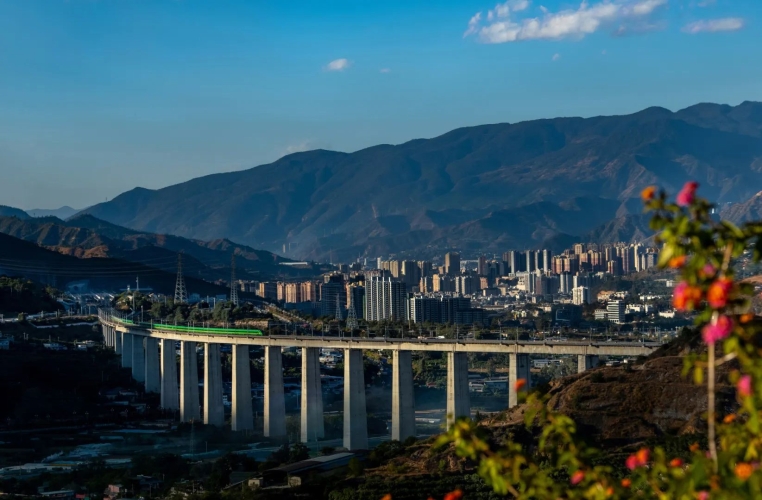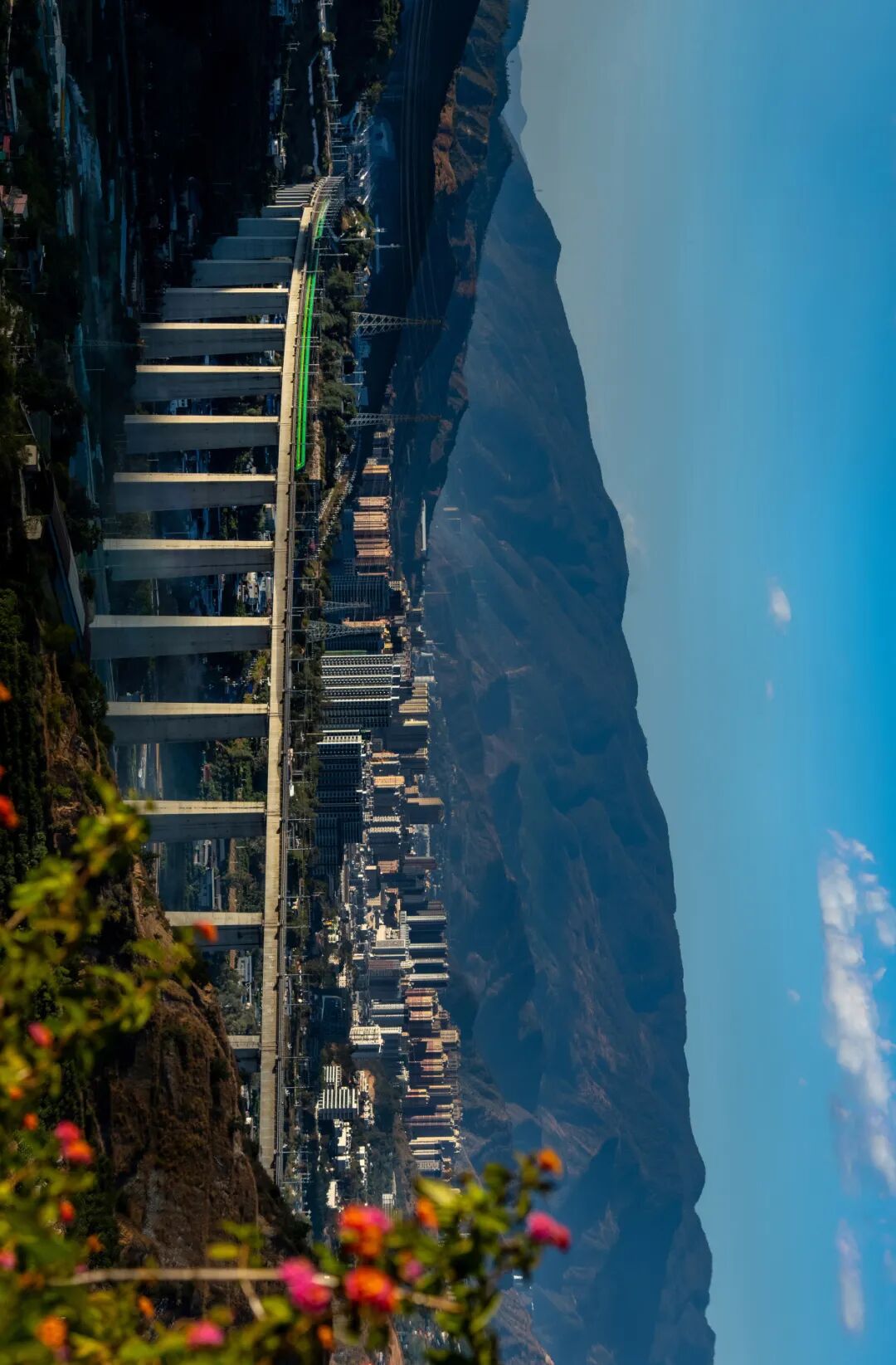 青山衔着城市轮廓,高架长桥托着绿轨列车掠过长空下的仁和城区。