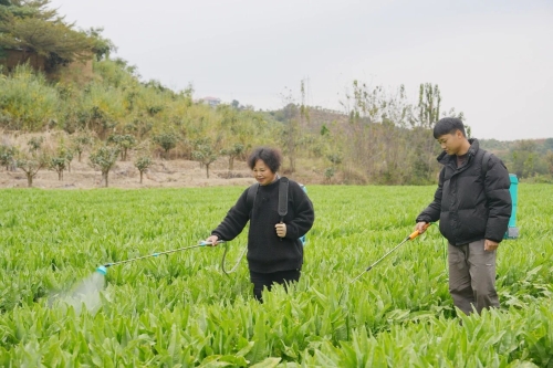 △ 谭祥瑞(右)与母亲在田间管理贡菜