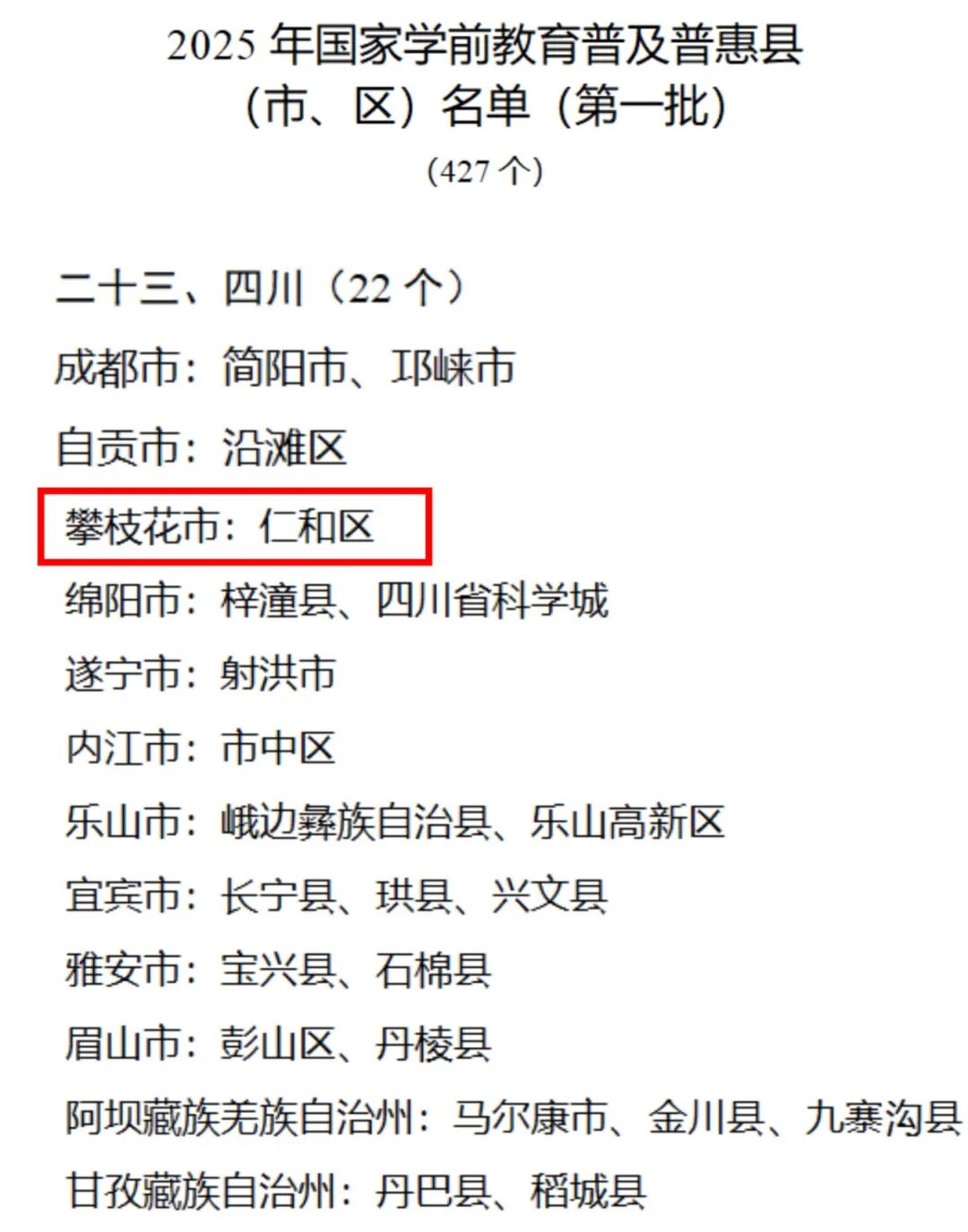 日前,教育部公布2025年学前教育普及普惠县(市、区)名单(第一批)认定结果,全国共427个县(市、区)通过认定,仁和区榜上有名。