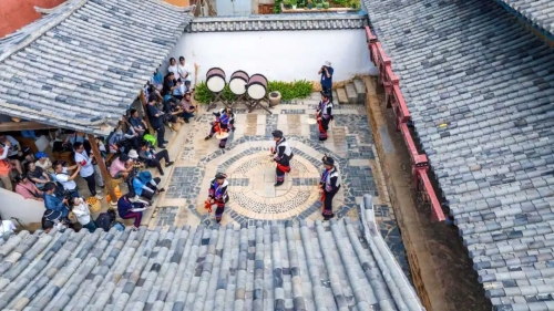 △ 游客们在迤沙拉非遗小院观看演出