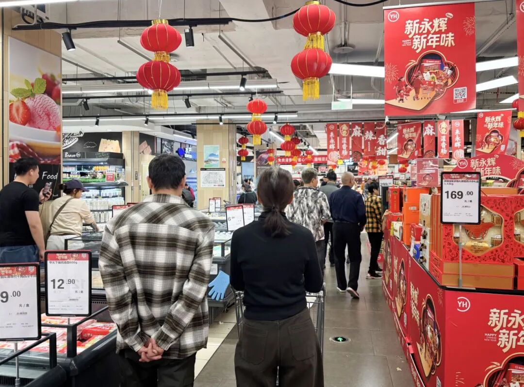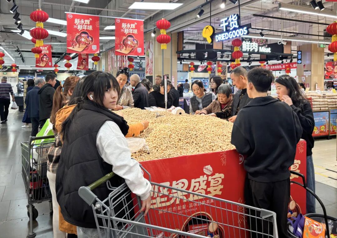 永辉超市人气爆棚、人头攒动,前来采购的市民摩肩接踵、络绎不绝,处处都是热闹的采购景象。生鲜区备货充足,各色水果、高山蔬菜、鲜切肉类摆满货架,炸货、卤味、坚果礼盒一应俱全,每个货柜前都围满了挑选年货的人,收银台也排起了长长的队伍,尽显新春采购的火热氛围。