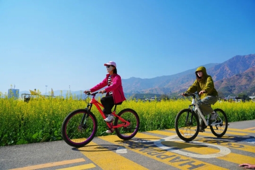 微风拂过,花浪起伏,淡淡花香弥漫在空气里。田埂上、花田间,游人如织,沉醉在满目春色之中;或骑着单车穿行其间,让春风与花香一路相伴;或举着相机、手机驻足取景,将灿烂春光定格成新春最美的纪念。开在家门口的花海,为春节增添了一抹温暖明亮的色彩。