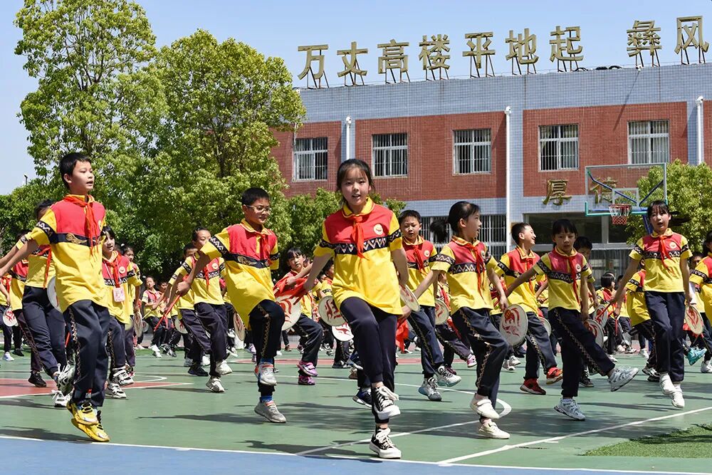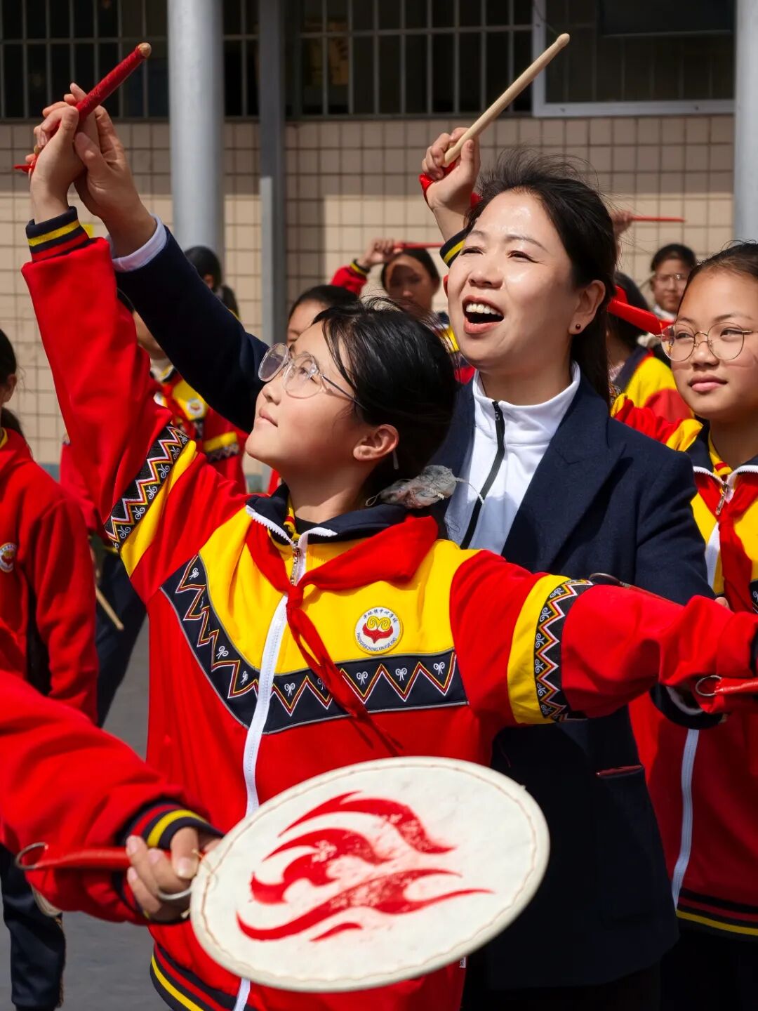 上午10点,《彝风鼓韵》的欢快旋律在平地镇中心学校的操场上准时响起。操场上,孩子们右手持鼓棒、左手握羊皮鼓,踩着节拍旋身起舞。张茂丽站在队伍旁,目光追随着每一个孩子——这套课间操,是她带着团队一点点打磨出来的。