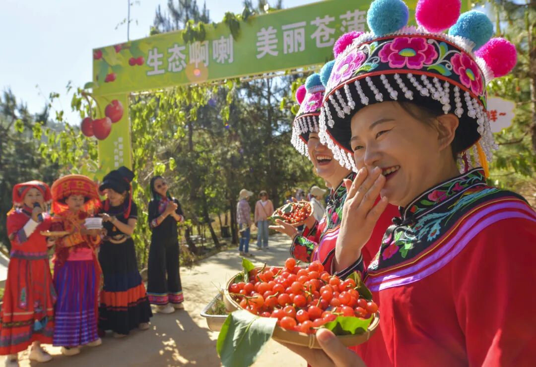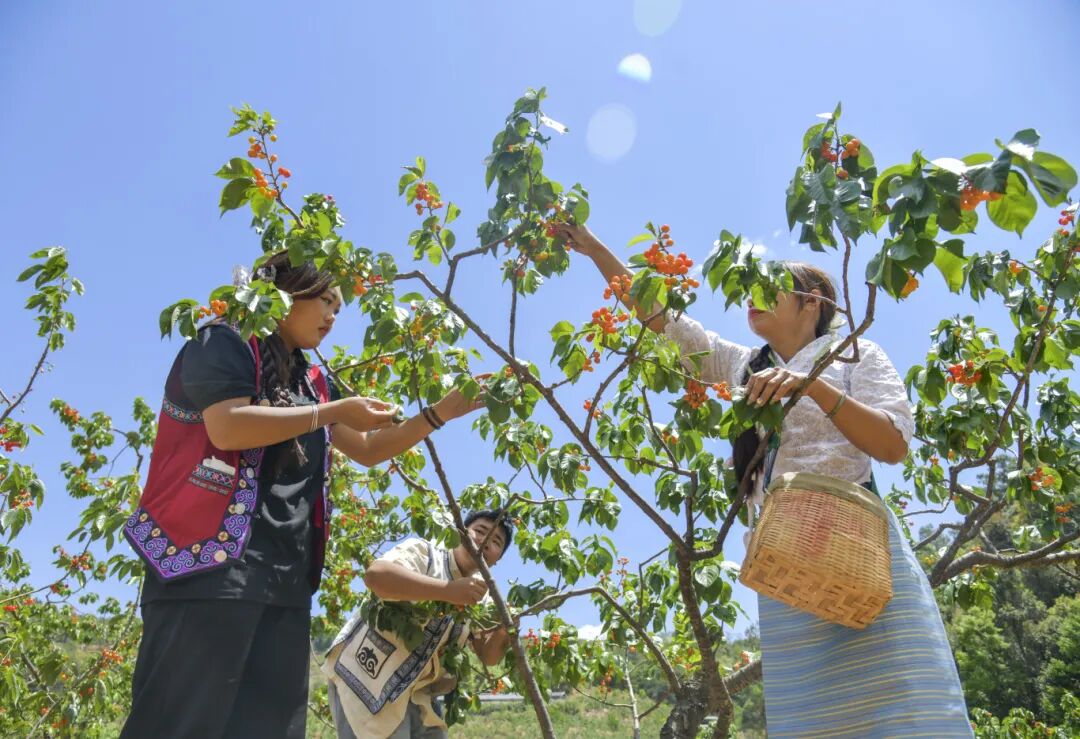 趣味互动过后,樱桃采摘园迎来大批游客,他们提着小篮在果林间穿梭寻觅。全乡6000余亩樱桃种植基地里,中华小樱桃、玛瑙红、黑钻等多个品种成熟待采。