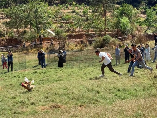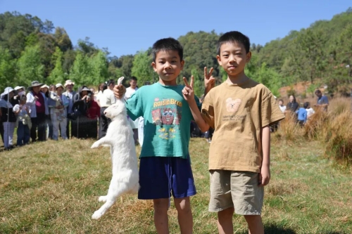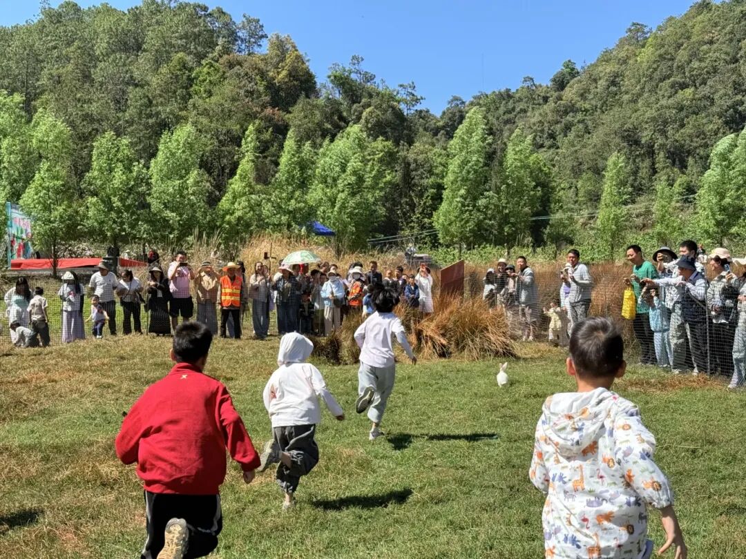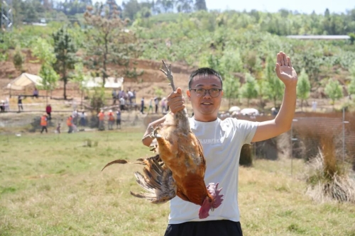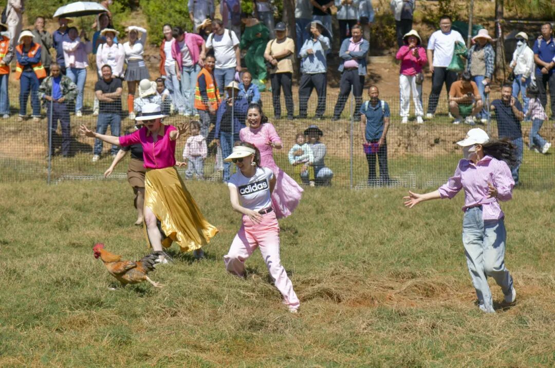 舞台一侧的田间空地,抓鸡捉兔比赛哨声响起。参与者冲入场内,尘土飞扬。市民刘晓鹏抱着刚抓到的鸡走出来:“特别兴奋,工作压力都释放了。”市民田维海一手提鸡一手拎兔:“两场一共花了37块6的入场费,鸡和兔都到手了。等下还要去摘樱桃、买农特产,今天玩得很尽兴。”
