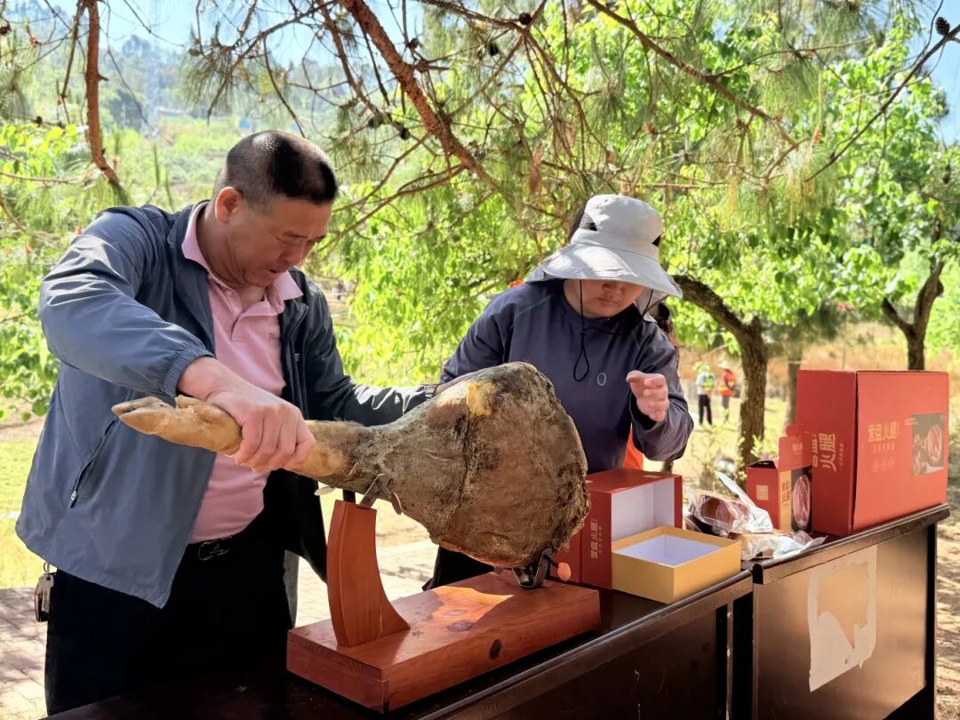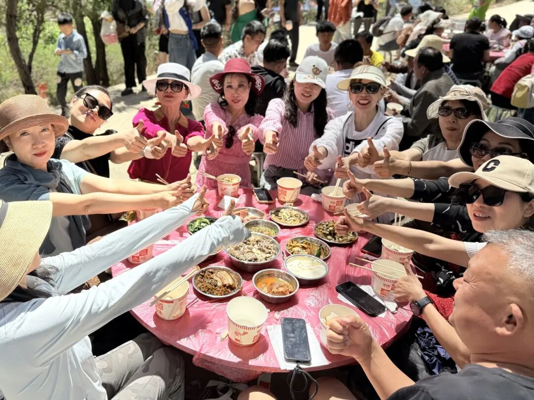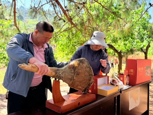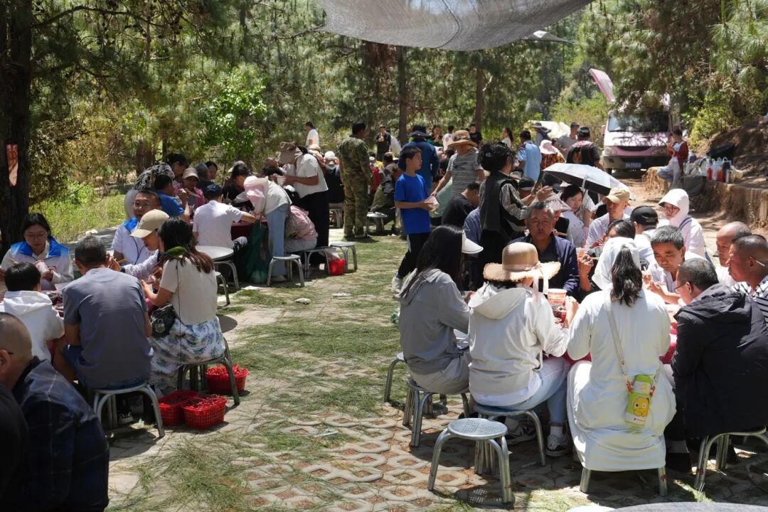 时至中午,人流渐渐聚向坝坝宴。50桌农家菜在樱桃园周边铺开,营盘火腿、炒鹿茸菌、炖羊肉陆续端上桌,游客围坐品尝地道乡野风味。