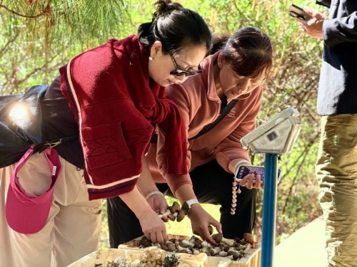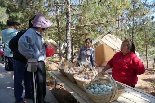 与之相邻的乡村集市同样人流如织,村民沿街摆售的大球盖菇、鹿茸菇、土鸡蛋等特产琳琅满目。村民杨春伦一边招呼顾客一边说:“今天带来的300多斤菌菇,已经卖了一大半,看这人气,下午卖完没问题,估计能有2000元左右收入。”