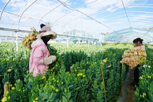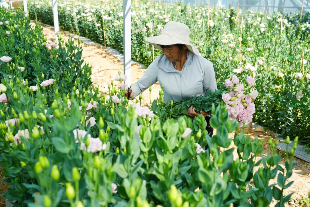 大棚内,花株挺立,白、茶、香槟色等16种花色错落绽放。花农们正俯身其间,忙碌采收。