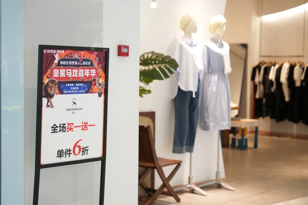 除此之外,在商场内,各品牌店铺门前摆放消费福利展板,节日造型比比皆是,营造出火热的节日氛围。“买一送一”“感恩回馈”等促销标语随处可见。