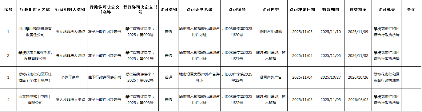 仁和区综合行政执法局行政许可信息公示(11.3-11.7)
