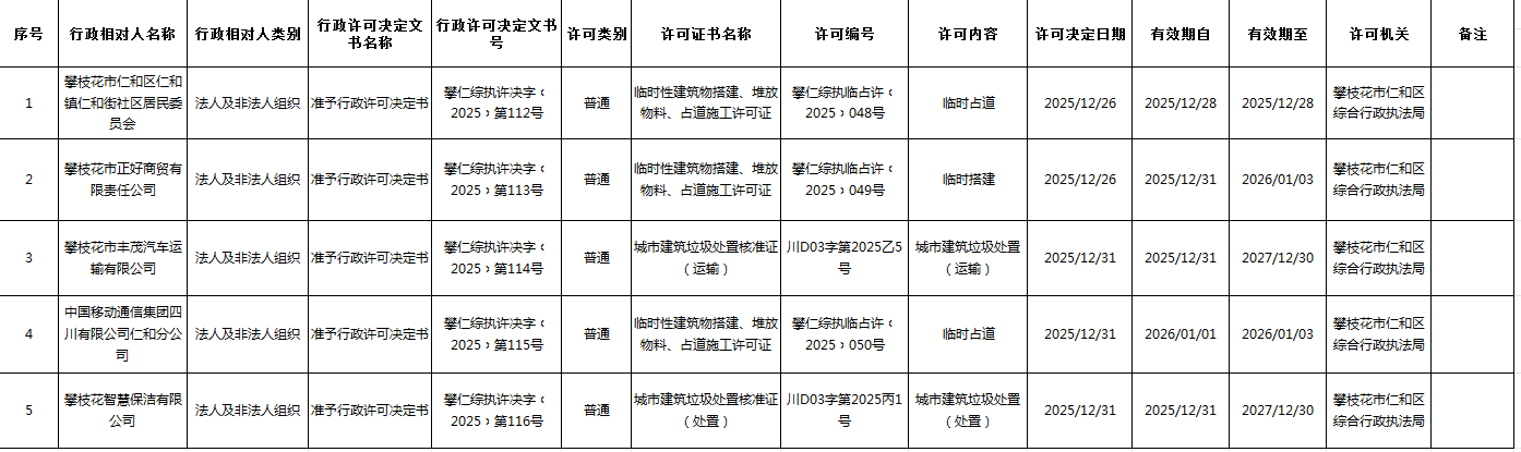 仁和区综合行政执法局行政许可信息公示(12.29-12.31)