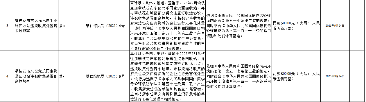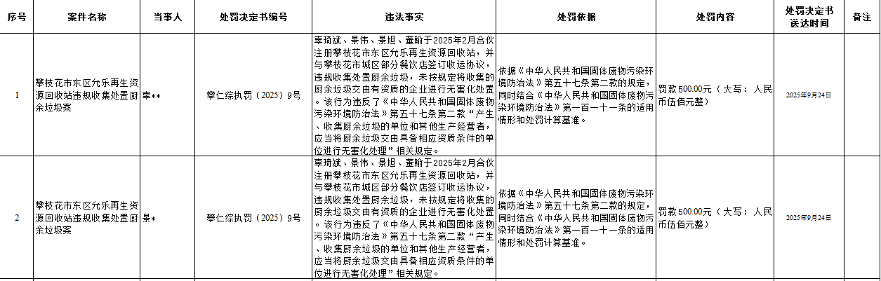 攀枝花市仁和区综合行政执法局2025年行政处罚案件信息公示(9月26日)