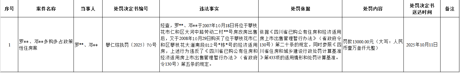 攀枝花市仁和区综合行政执法局2025年行政处罚案件信息公示(10月13日)