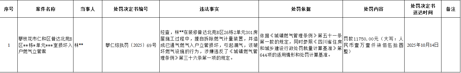 攀枝花市仁和区综合行政执法局2025年行政处罚案件信息公示(10月16日)