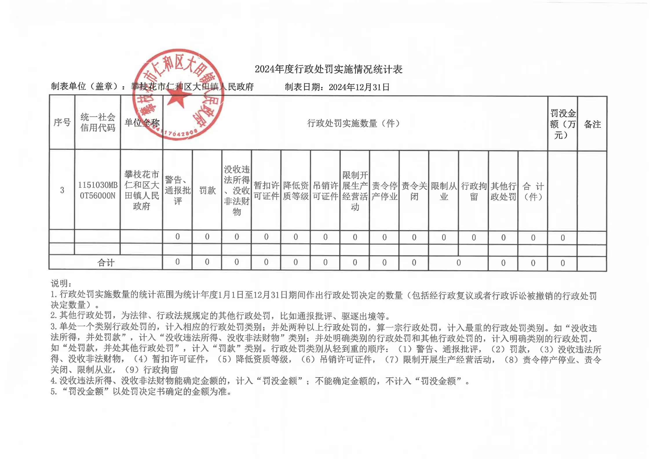 攀枝花市仁和区大田镇人民政府2024年度行政处罚实施情况统计表